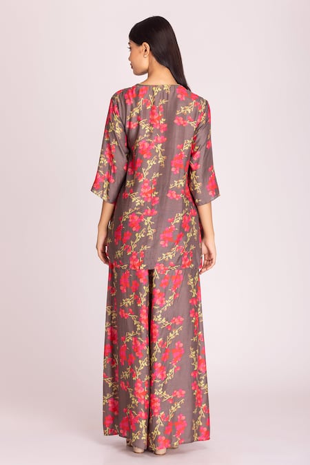 Brown cotton silk tunic featuring floral digital print with sequins and beaded embroidery. Paired with flared pant for a coordinated look.