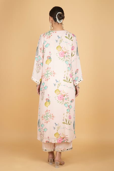 Pink floral print kurta in georgette featuring a V-neck and embellished details. Paired with matching modal silk pants and an organza dupatta.