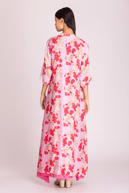 Barbie pink high-low kaftan featuring floral digital print with sequins and beaded hand embroidery. Comes with an inner layer.