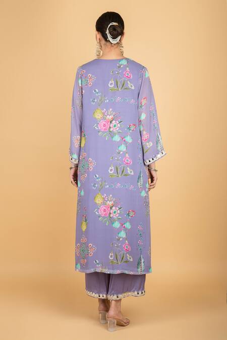Purple kurta in georgette featuring floral print and a V-neckline. Paired with modal silk pants and an organza dupatta.