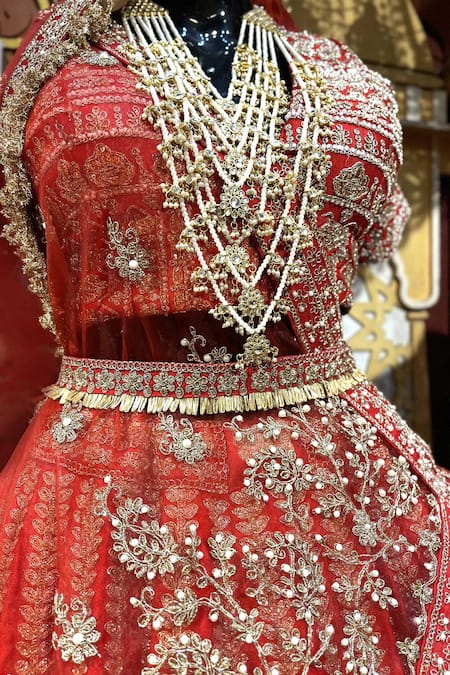 Red Silk, Net, Cotton Beads, Sequins, Dabka And Embroidered Bridal Lehenga Set