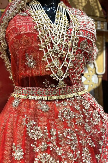 Red Silk, Net Beads, Sequins, Zari, Floral Banarasi Woven Bridal Lehenga Set