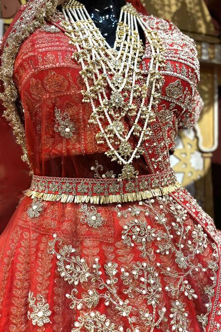 Red lehenga featuring floral bloom garden motifs with zari, dabka dori, sitara sequins, beads and pearls embroidery. Paired with a padded blouse, a belt, and two dupattas with intricate embroidery and lace borders.