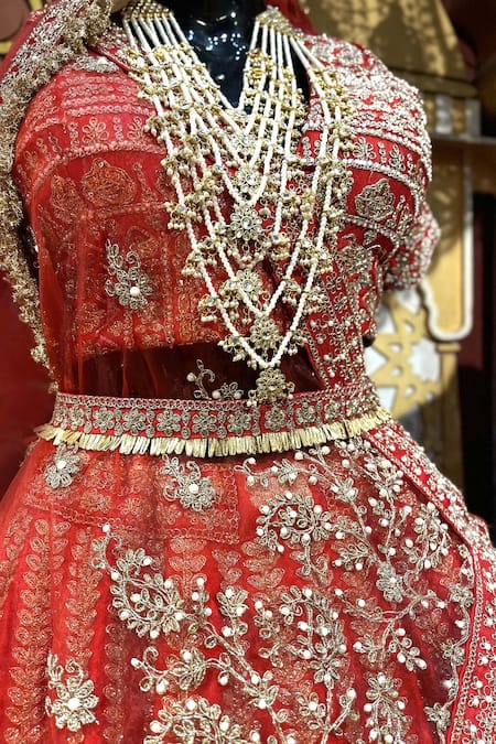 Red Silk, Net, Cotton Beads, Pearls, Sequins, Sitara And Bridal Lehenga Set