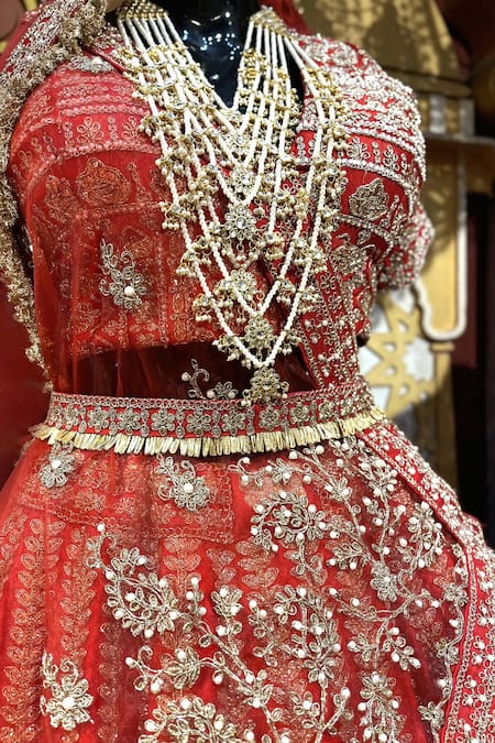 Red Silk, Net, Cotton Beads, Pearls, Sequins, Sitara Paisley Bridal Lehenga Set