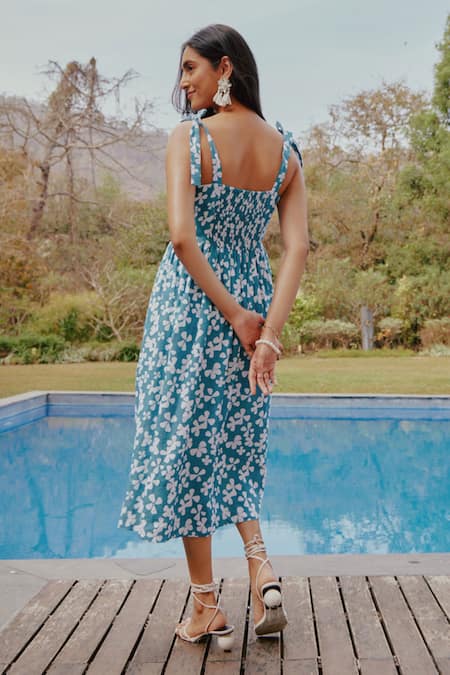White and green midi dress featuring a bloom print, sweetheart neckline, and pleated bust with front cut-out detailing