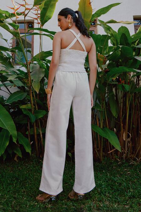 White paper bag pant in denim fabric featuring an elasticated waistband