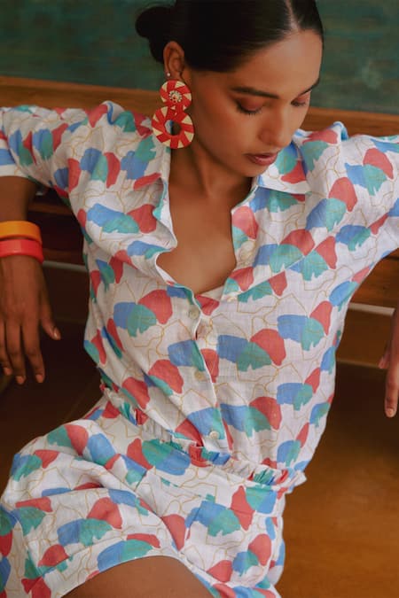 Multicolor floral print shirt featuring a collar and full sleeves. Paired with matching shorts with an elastic waistband.