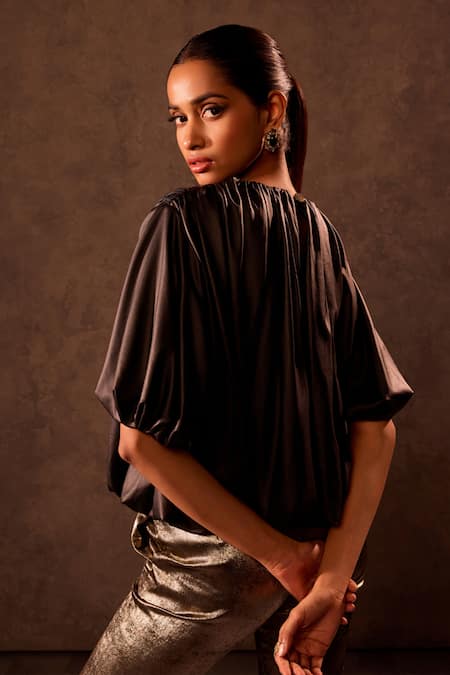 Black Lurex Round Neck Gathered Bubble Top
