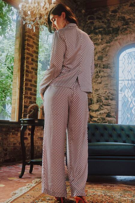 Geometric print design on modal satin fabric, Shawl collar for added elegance, Relaxed fit for comfort
