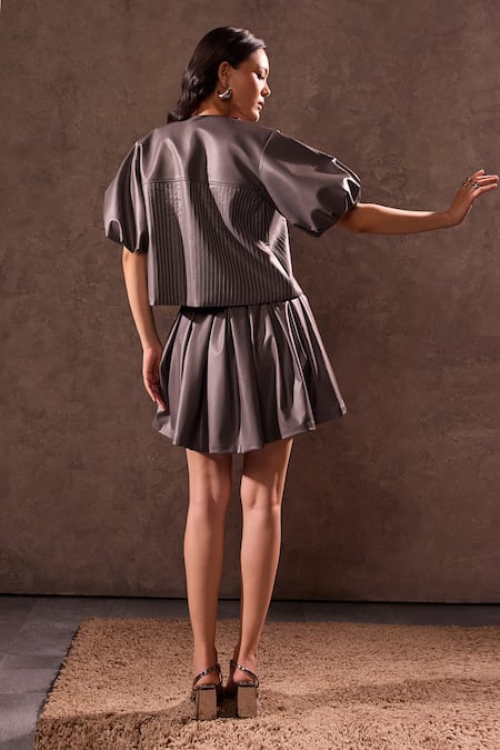 Grey jacket featuring stitchline thread embroidery and bubble sleeves