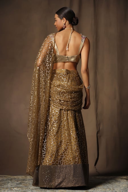 Brown pre-draped saree in butterfly net featuring sequins and thread embroidery. Paired with a matching blouse with a sweetheart neckline and sleeveless design.