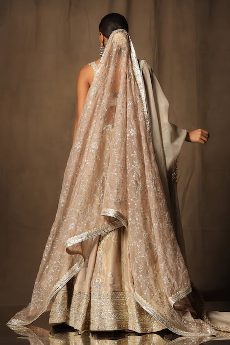 Beige silk lehenga featuring floral and sequins embroidery with attached cancan. Paired with a padded blouse and a dupatta.