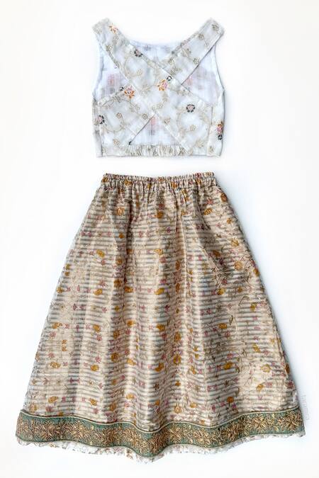 Ivory sleeveless brocade blouse featuring flora vine woven details and criss-cross back. Paired with a lurex striped cotton silk floral pattern lehenga and a sequin bloom embroidered organza dupatta.