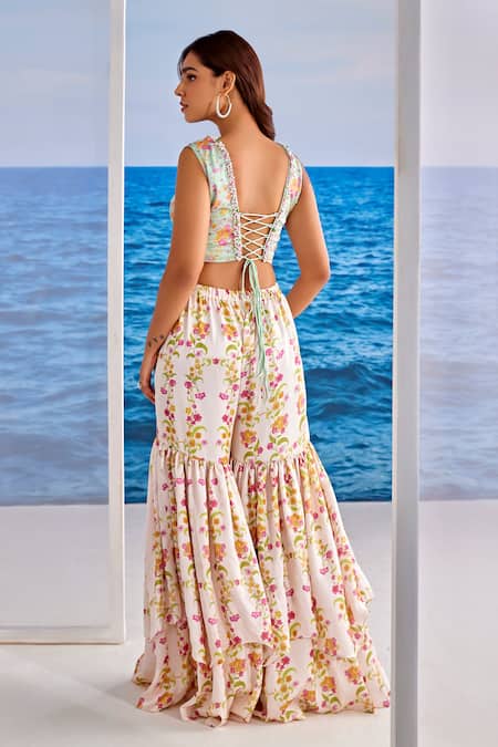 Sage green blouse featuring floral print with sequin, bead, and pearl embroidery on a V neckline. Paired with an off-white printed tiered sharara and a scallop bordered organza cape dupatta.