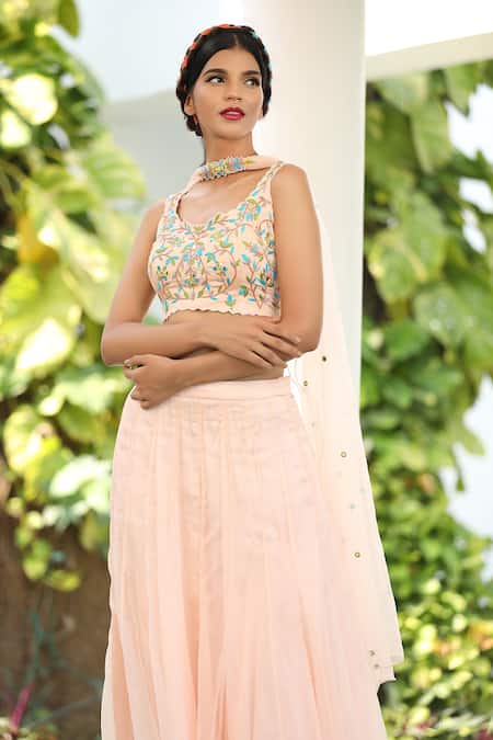 Peach pleated lehenga with scallop trimmed flower embroidered and mirror work blouse, and choker dupatta.