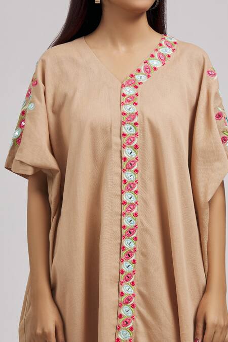 Beige linen cotton kurta featuring hand embroidered placket with mirror and resham work. Paired with straight beige pant.