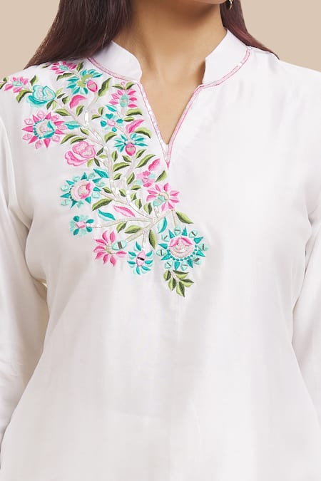 White kurta featuring asymmetric multi-colored floral and thread hand embroidery. Paired with matching pant, both made from cotton chanderi with attached lining.