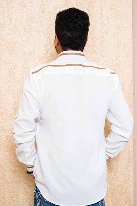 White long sleeve button down shirt featuring contrasting beige leatherite stripes