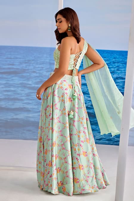 Sage green one shoulder blouse with floral embroidery featuring dabka, pitta, and sequin work. Paired with a printed lehenga in floral patterns with an attached cancan.