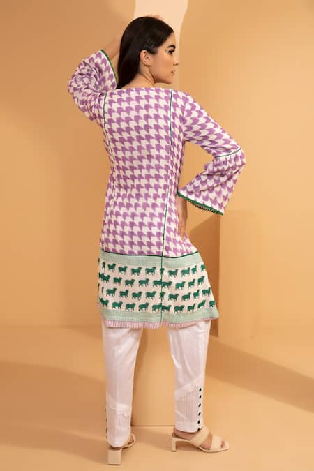 Multicolor kurta with chevron, animal print. Paired with white pant.