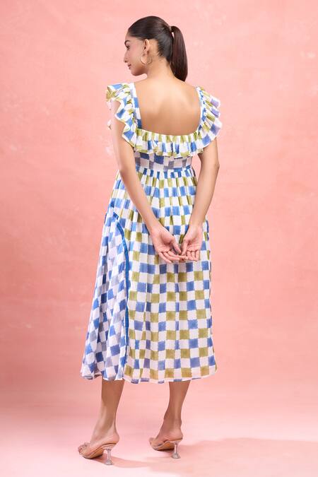 Contrasting short frill on the square neck, Flowy A-line shape with curving panels, Delicate soft gingham checks pattern