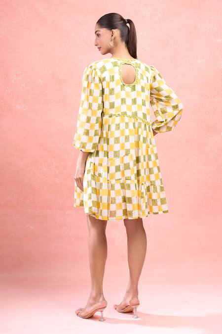 Multi Color Cotton V-neck Checkered Tiered Dress