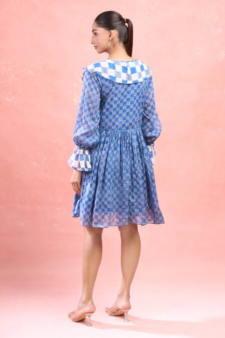 Multi color dress featuring a sailor collar with bold harlequin checks