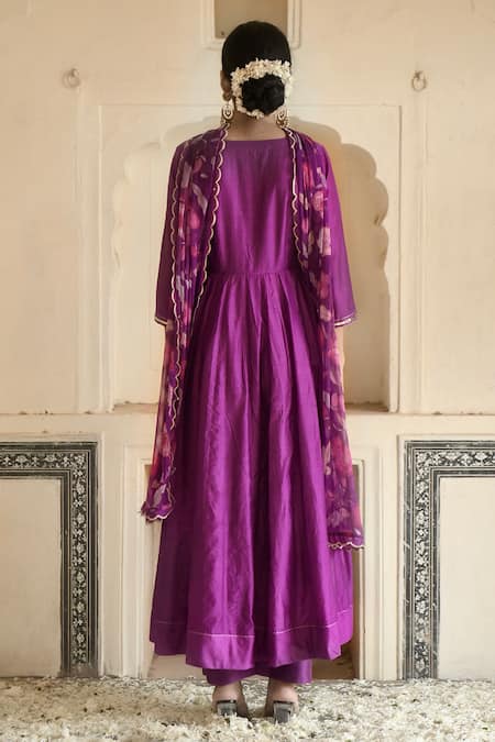 Russian violet chanderi silk anarkali with hand work in cut dana & sequins, surplice neck & side pockets. Paired with straight pants & chiffon floral printed scalloped border dupatta.