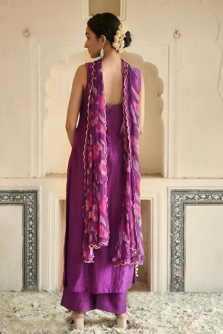 Russian violet chanderi silk kurta with hand work in cut dana & sequins, sweetheart neck & high side slits. Paired with straight pants & chiffon floral printed scalloped border dupatta.