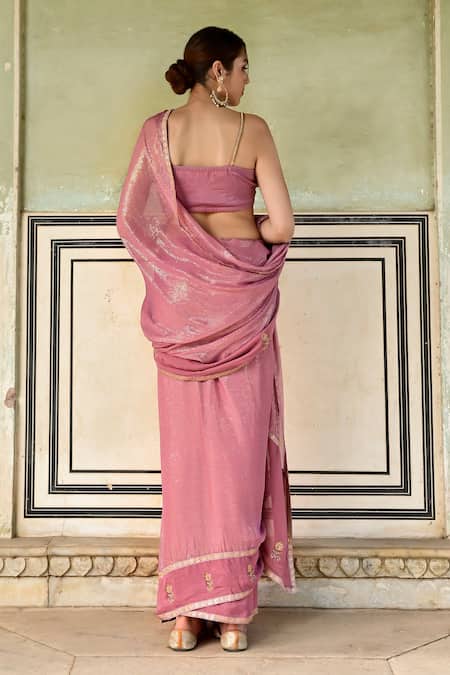 Purple saree featuring lurex stripe woven motifs with zari, sequin, and cutdana embroidered border. Comes with an unstitched blouse piece.