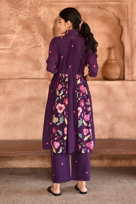Russian violet anarkali with floral print panels, shirt collar & side pockets. Paired with printed pants & cotton slip.