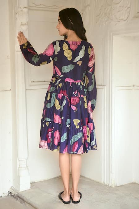 Persian blue full sleeve tiered dress made in chanderi silk base, accentuated with all over contrast floral print