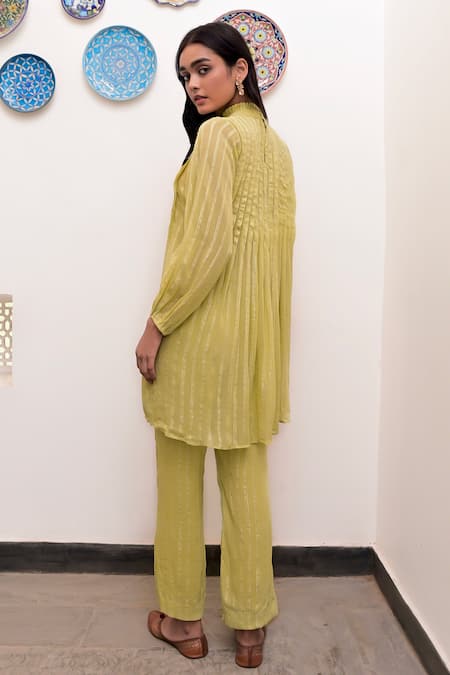 Pista green cotton lurex tunic featuring a high neck and puffed sleeves with a silver zari textured pattern. Paired with straight pants that complement the tunic design.