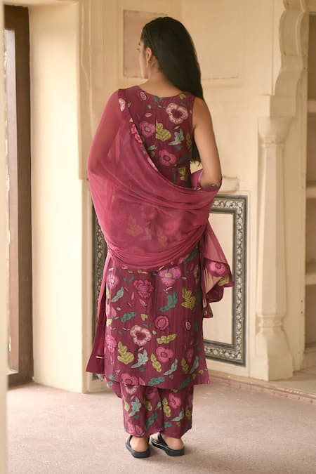 Wine Chanderi Silk, Dupatta Chiffon Floral Print V Shiraz Flower Kurta Set