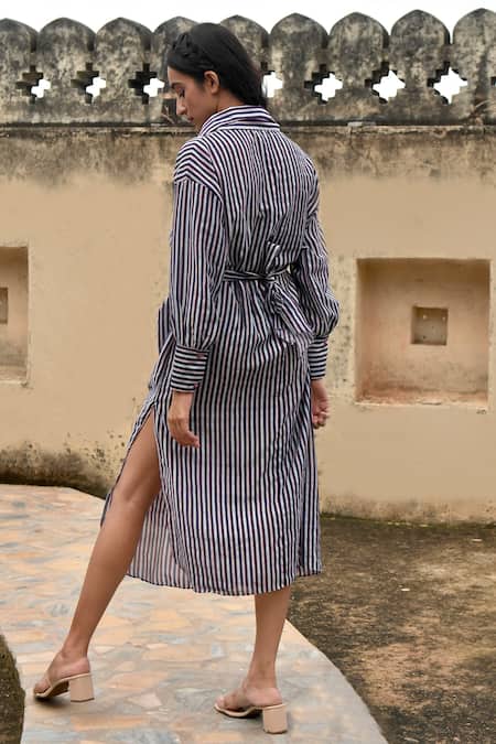 Blue chanderi silk shirt dress featuring an all-over stripe print, collared neck, and drop shoulder bishop sleeves