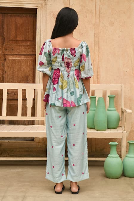 Blue Chanderi Silk Square Neck Vivid Sky Floral Print Top