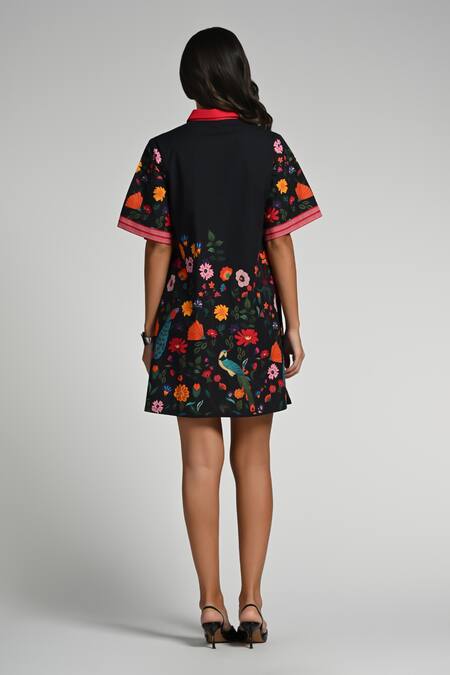Black dress crafted from quality cotton poplin featuring vibrant floral embroidery