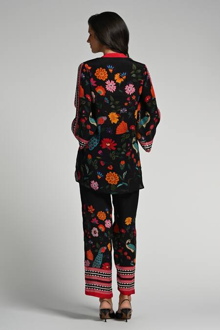 Black floral tunic featuring vibrant floral embroidery and a relaxed fit. Paired with matching black pants with elastic closure and floral detailing.