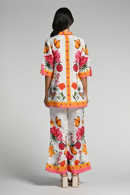 Multi-color linen co-ord set featuring a floral print shirt with a button-down front and a matching pant with an elastic closure. The set showcases vibrant butterflies and ladybugs throughout the design.