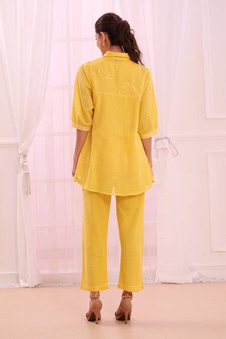 Yellow silk cotton blend shirt featuring floral embroidery and a collar. Paired with matching pants for a complete look.