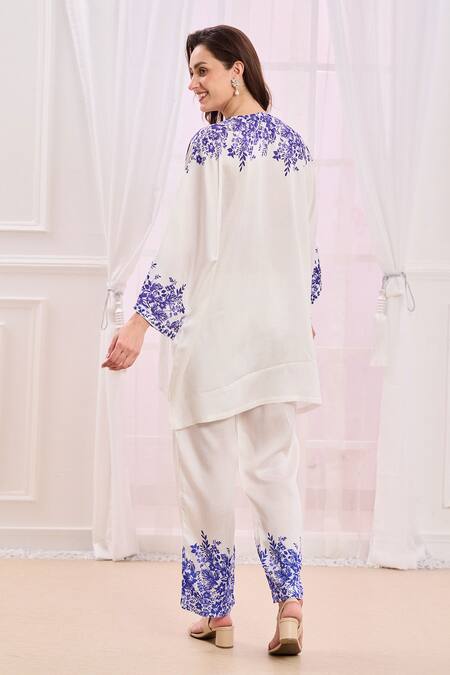 White Silk, Linen Embroidery V-neck Floral Kurta And Pant Set