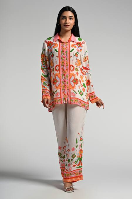 Vibrant floral embroidery all over the top and pants, Contrast color detailing on cuffs and collar, Button-down front with decorative elements