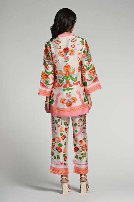 Multi Color Silk, Linen, Modal Embroidery Mandarin Floral Utopia Tunic Set