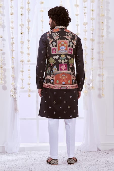 Black Nehru jacket featuring kalamkari thread embroidery in majestic darbar and floral patterns