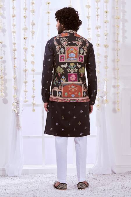 Black bundi featuring kalamkari thread embroidery in a majestic darbar pattern. Paired with a matching embroidered kurta and pant.