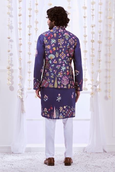 Navy bundi featuring kalamkari thread embroidery in a floral pattern. Paired with a matching kurta and pant for a complete look.