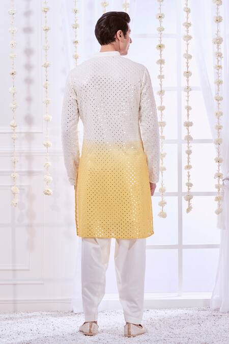 Yellow ombre straight kurta featuring tonal chikankari embroidery with mirror work. Paired with a solid pyjama, this set is crafted from silk and cotton for comfort.