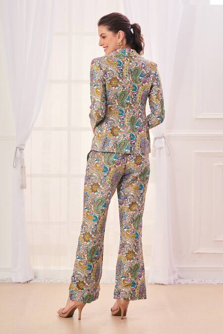 Multi Color Silk Blend Embroidered Paisley Jacket Lapel Collar Pant Set