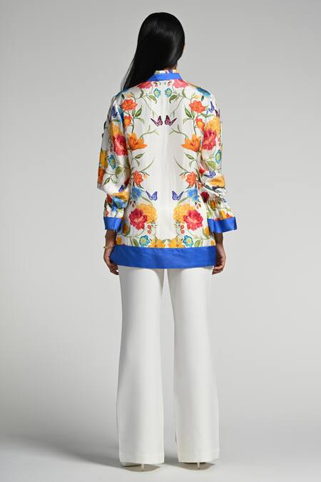 White Silk, Modal, Satin Mandarin Collar Papillion Garden Shirt